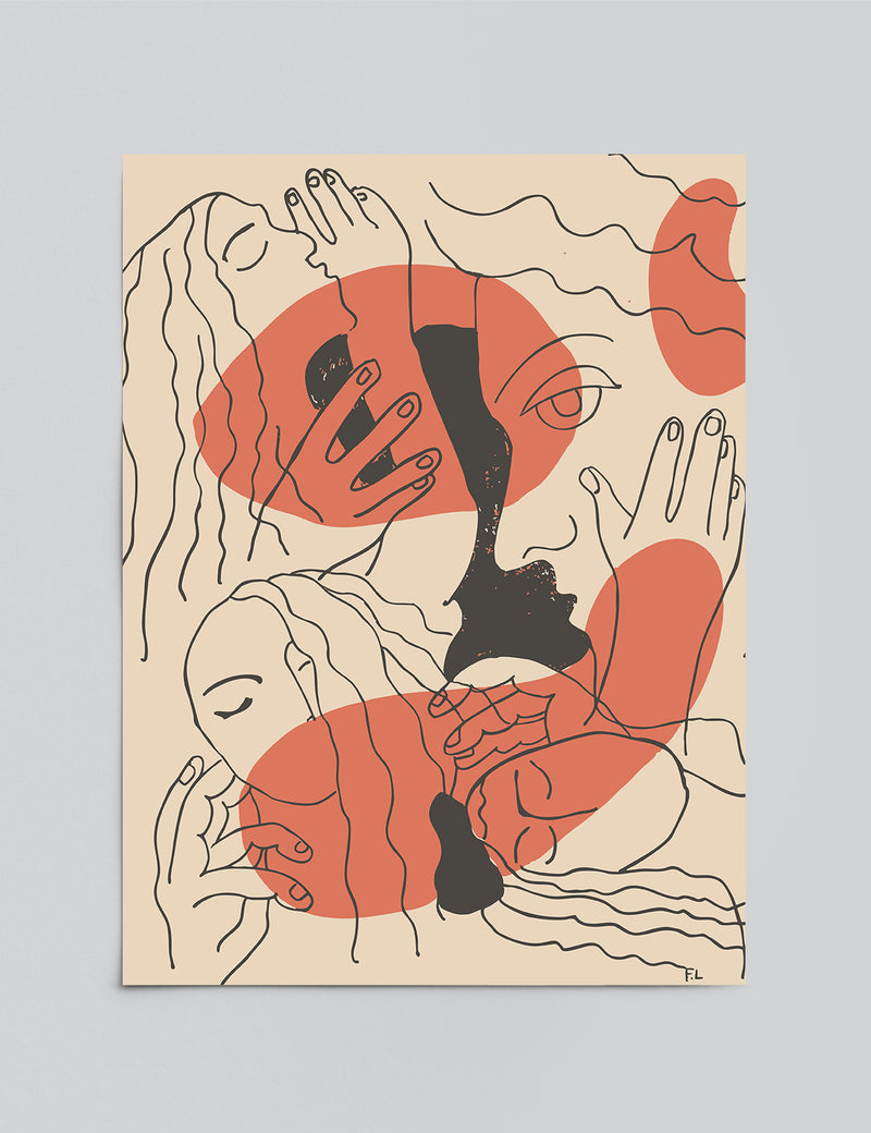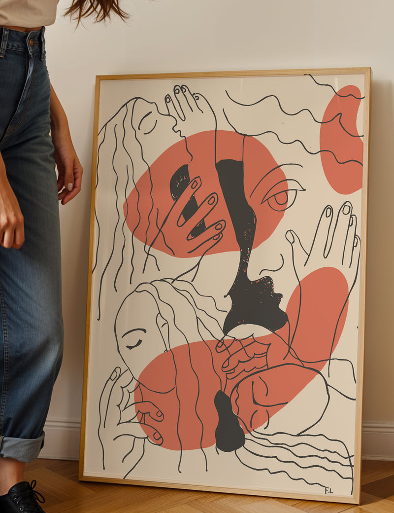 This expressive artwork captures a tapestry of overlapping faces and hands, creating a sense of connection, emotion and movement. The flowing lines and layered forms convey the closeness of human experience, making it a striking statement piece for any modern interior.