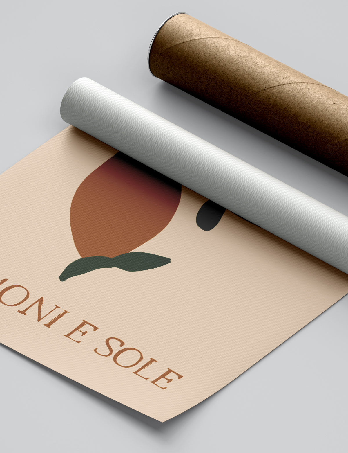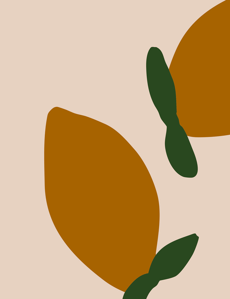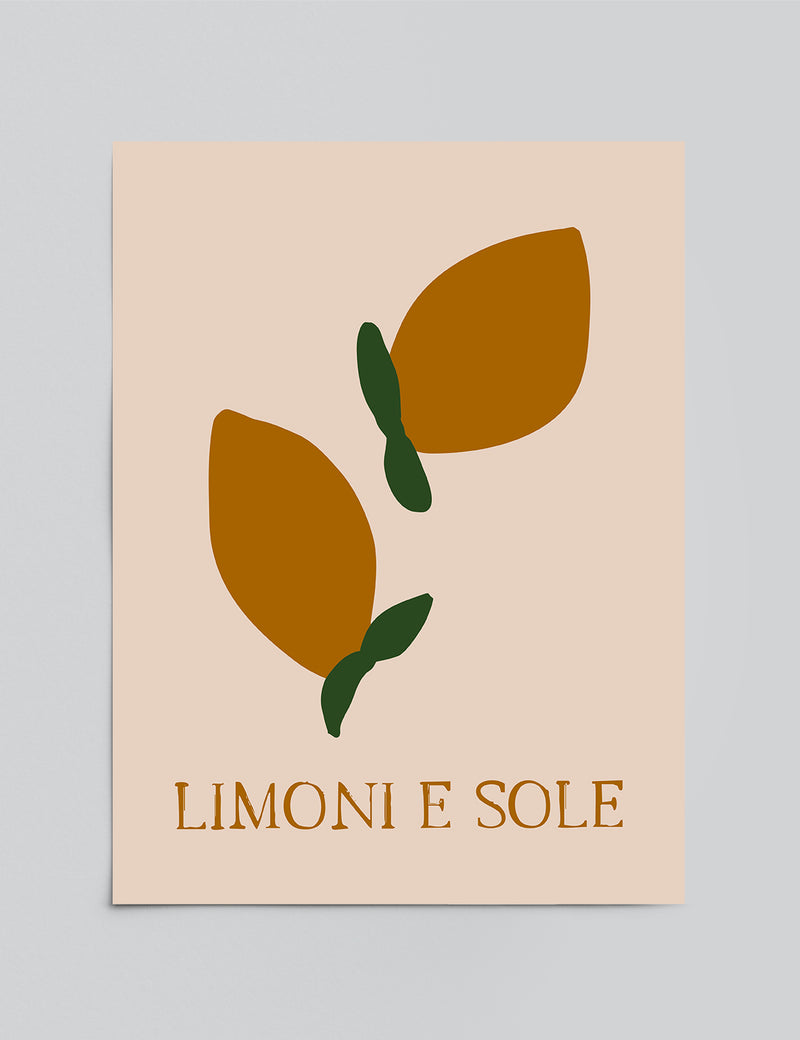 Two stylised lemons drift across a soft neutral background, their warm golden tones balanced by deep green leaves. The composition is simple and intentional, drawing inspiration from sun-soaked Italian afternoons, fresh citrus groves and the effortless beauty of Mediterranean still life.