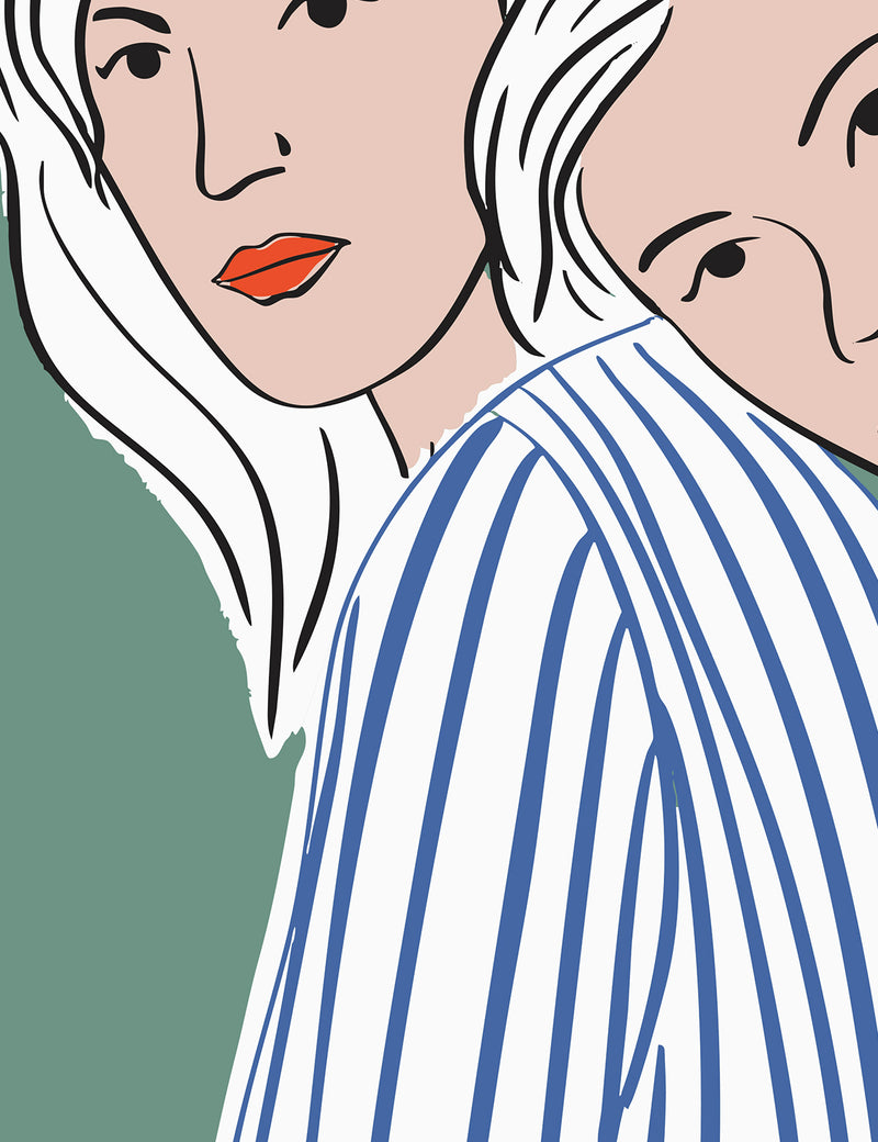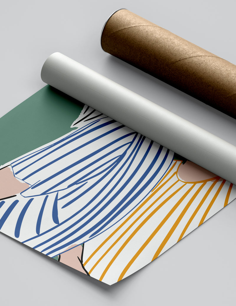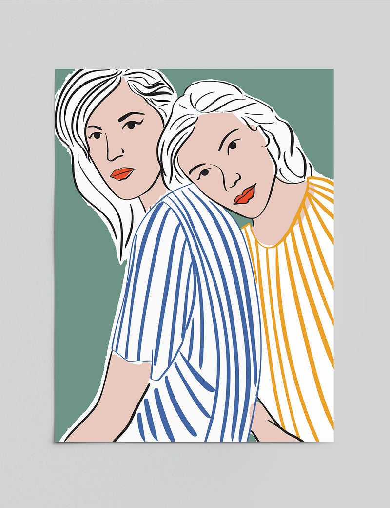 Celebrate the warmth of connection with this expressive illustration of two women leaning gently into one another. The flowing striped fabrics and soft, hand-drawn lines give the piece a calm, modern feel that suits bedrooms, living spaces and creative studios.