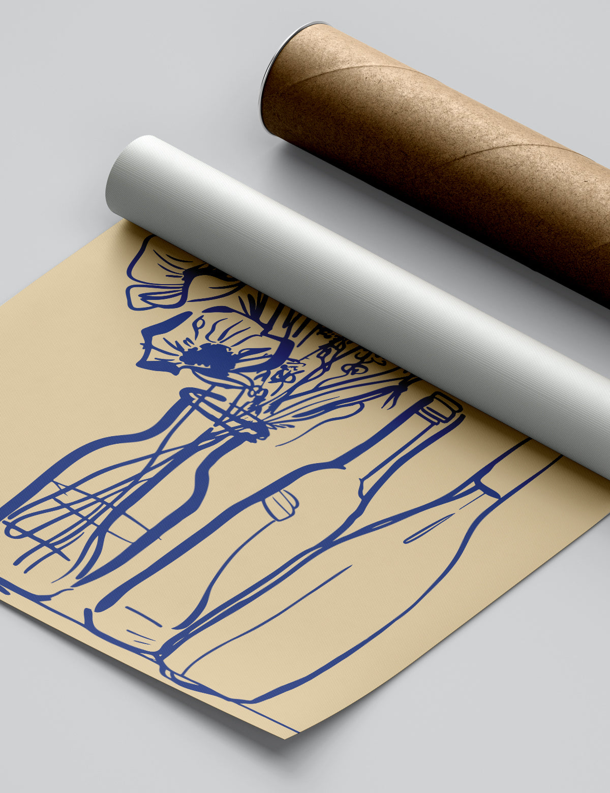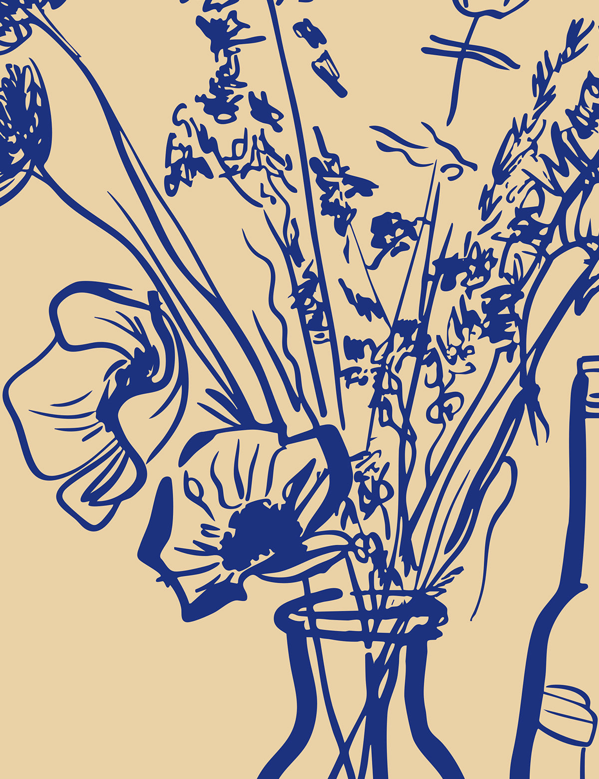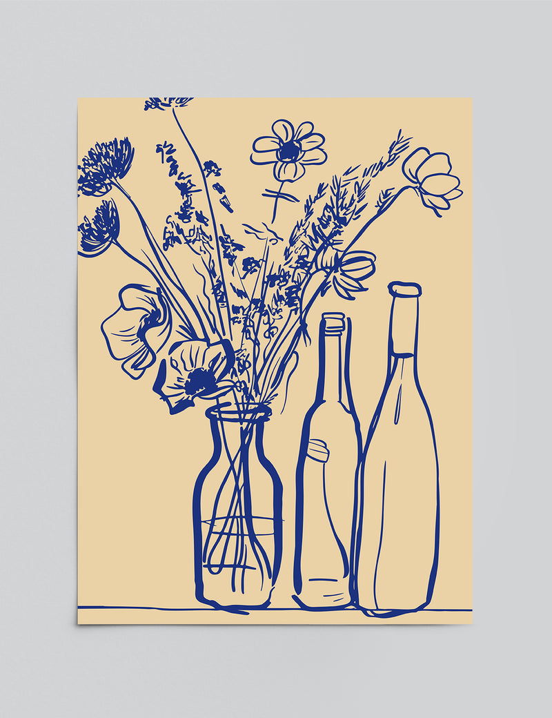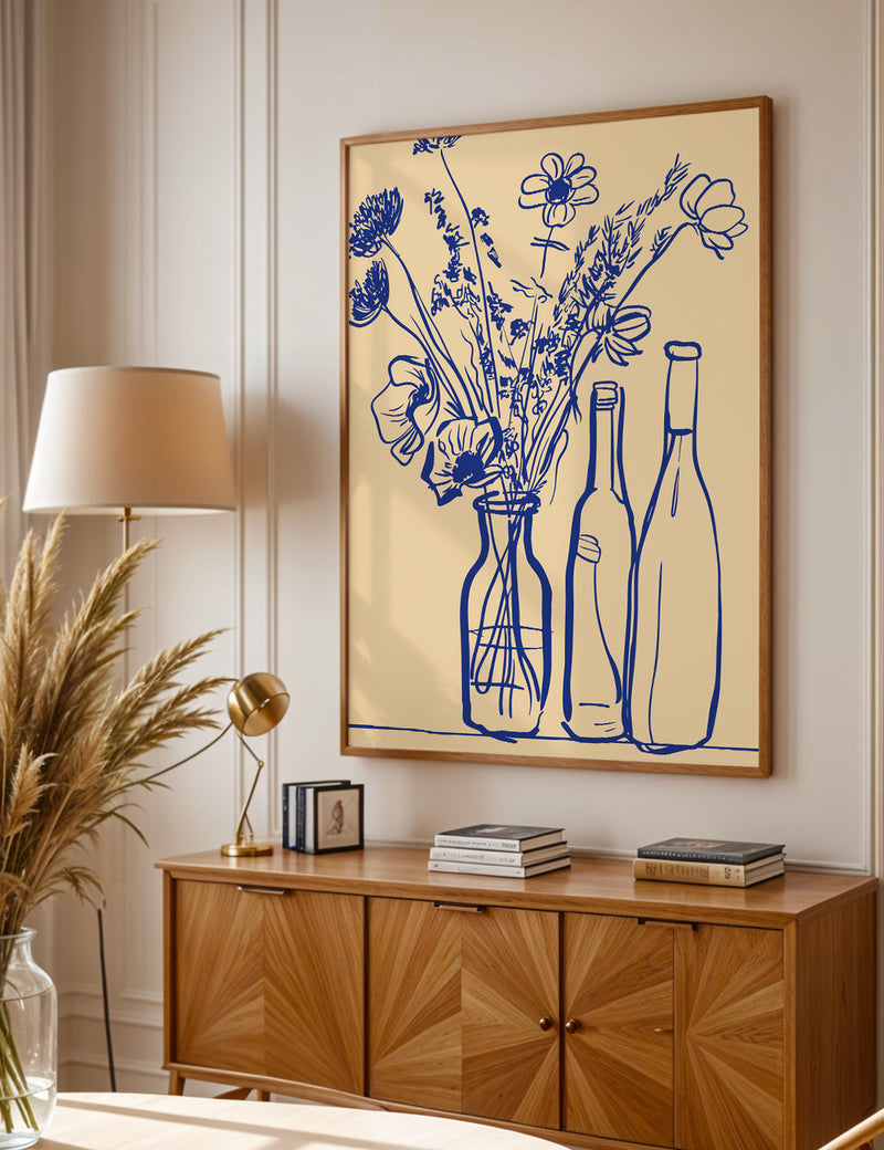 “Sunlit Table Stories” captures the warmth of an afternoon shared with someone you love. This expressive line-art piece brings together wildflowers, wine bottles, and soft golden tones to create a scene that feels relaxed, familiar, and full of heart.