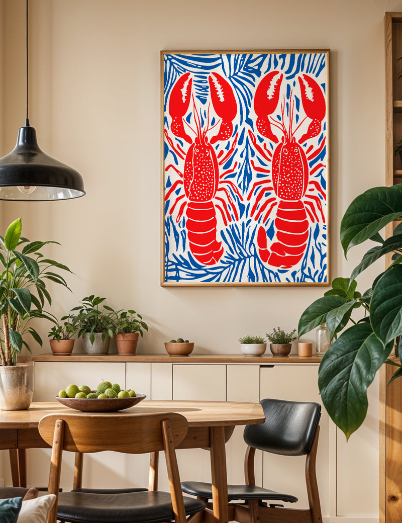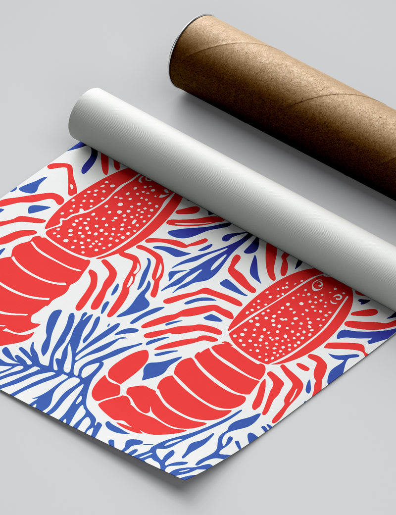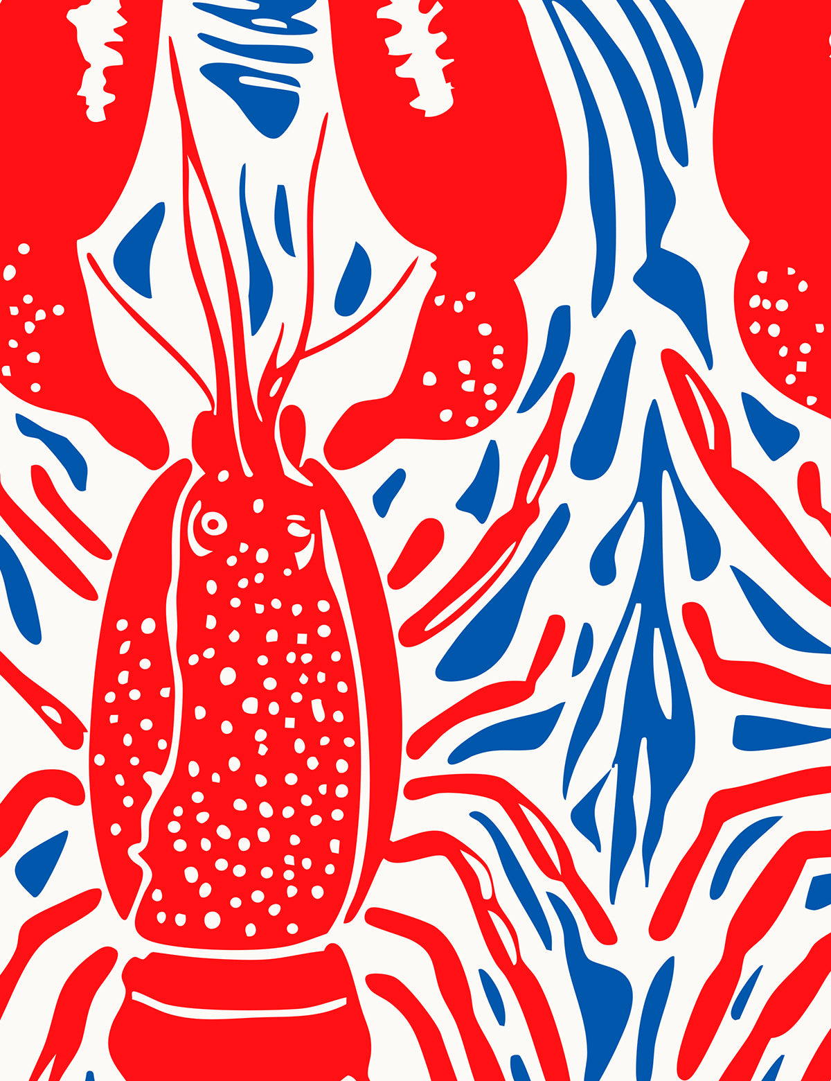 Tide Twins captures the playful rhythm of coastal life. A bold, symmetrical dance between two lobsters surrounded by flowing ocean foliage. The design feels both whimsical and grounded, echoing seaside summers and the vitality of marine life.
