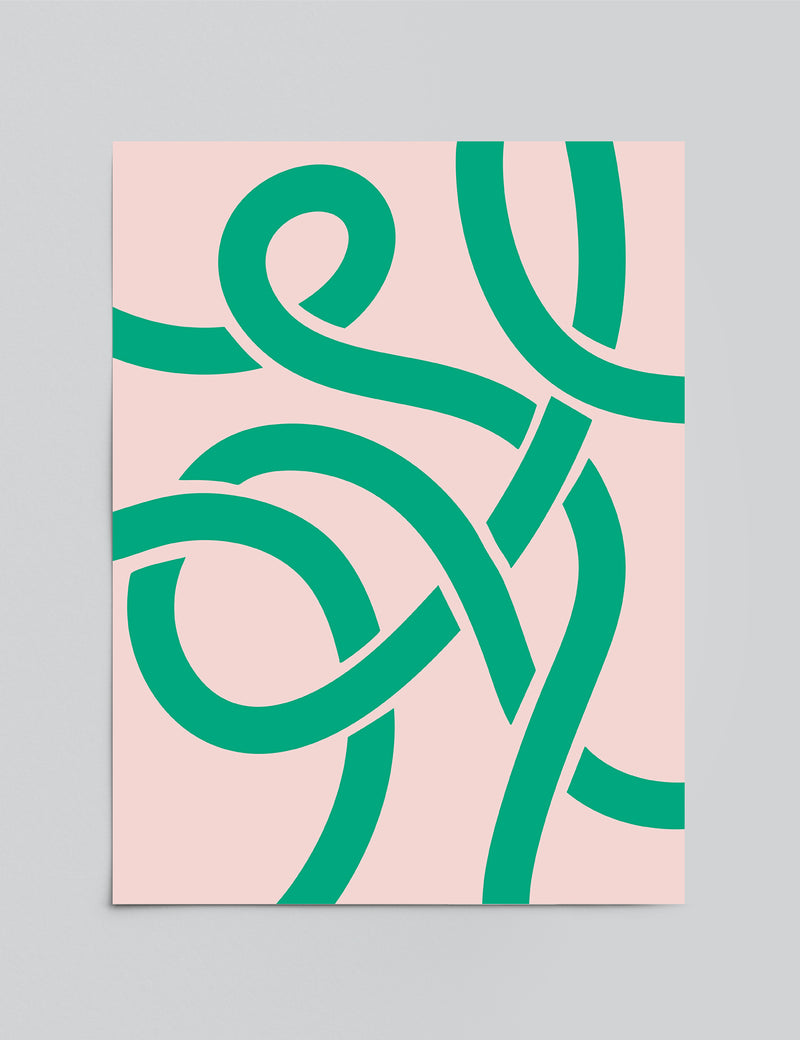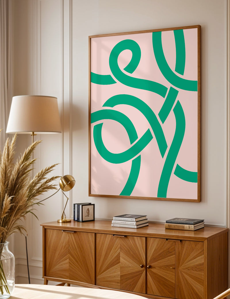 Verdant Flow is a modern, organic abstract artwork that captures the calm rhythm of nature through sweeping green curves and soft pink undertones. The interwoven shapes create a sense of harmony and movement, evoking growth, renewal, and connection.
